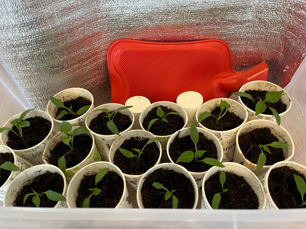- Termofor: Pokud máte doma teplotní výkyvy, naplňte termofor horkou vodou a umístěte ho blízko kelímků (ale nenechte, aby se jich dotýkal). Tento způsob „ topení“ je vhodný především pro teplomilnou zeleninu – rajčata a papriku. Hodí se i pro nový výsev.